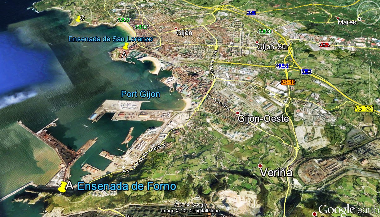 arriba: Localización (A inferior) respecto al Gijón romano y actual.