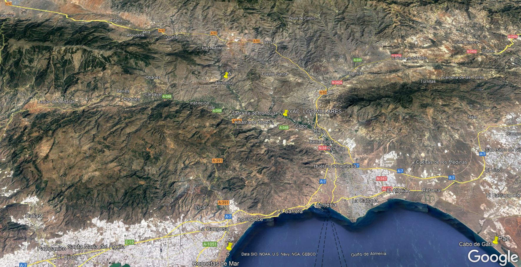 arriba: Localización (A) respecto de Almería, A-92 y ñla ciudad de Almería.